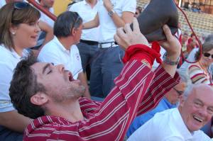 Burghie Westmorland, right, and Alexander Fiske-Harrison, enjoying a ‘bota’ of wine in the bullring of Cuéllar in Old Castile in 2013, where Fiske-Harrison had just run with the bulls in his Eton College Athletics Team ‘colours’ blazer that morning.