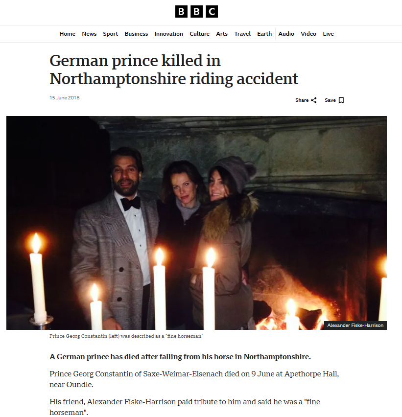 FACEBOOK: Alexander Fiske-Harrison’s post 12 June 2018 Rest In Peace my poor friend Con – Prince Constantin von Saxe-Weimar. It seems like yesterday that we dined like this by candlelight in the hall of Apethorpe Palace and you cooked over the great fire and you got me to help in your subterfuge so you could ask Olivia to marry you, and you nearly dropped the diamond in the dark and I lit the fireworks for you in the park afterwards and set fire to myself in the same grounds where you have fallen. I remember most the quiet nights like the next one when we dined à quatre and the Puligny-Montrachet never ran out. And all those London nights at your place on Lots Road and the Chelsea Ram back when we were neighbours. I remember you riding in that race at Cheltenham and polo in Berkshire and your stories of riding to your hounds in France. That such a fine horseman should go out that way. My thoughts and prayers are with you and your family. Goodbye my friend…