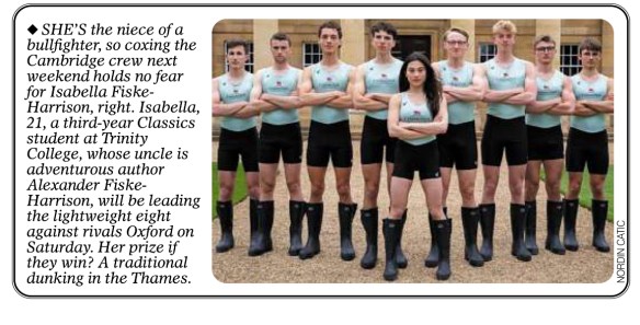 SHE’S the niece of a bullfighter, so coxing the Cambridge crew next weekend holds no fear for Isabella Fiske-Harrison, right. Isabella, 21, a third-year Classics student at Trinity College, whose uncle is adventurous author Alexander Fiske-Harrison, will be leading the lightweight eight against rivals Oxford on Saturday. Her prize if they win? A traditional dunking in the Thames.