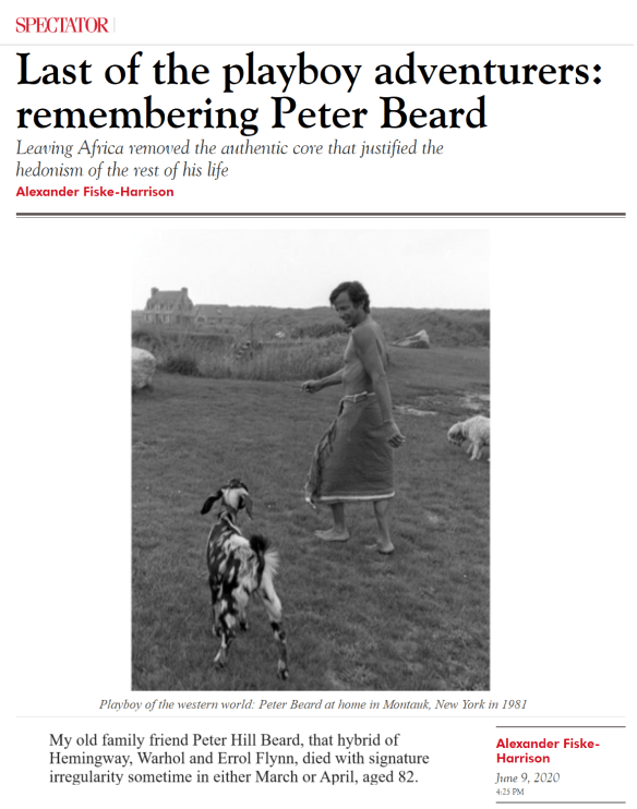 My old family friend Peter Hill Beard, that hybrid of Hemingway, Warhol and Errol Flynn, died with signature irregularity sometime in either March or April, aged 82.